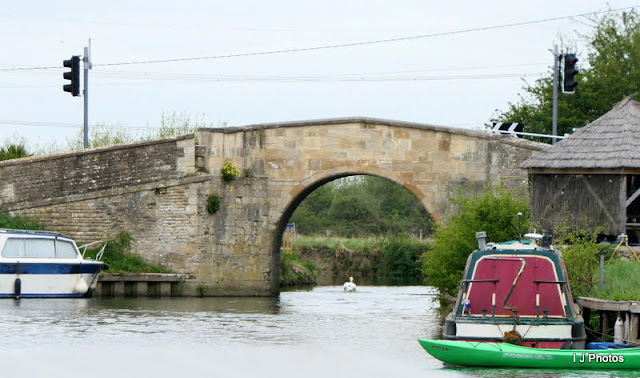 17 miles and 6 locks done. We never made it to Pinkhill meadow, much too far, and time was getting on. By 3.30 pm, a mooring was being looked for. At Newbridge, about 2 miles from Northmoor lock, the perfect spot was seen. But by now we had sailed right past, and we didn't think the river was wide enough to wind, so Ian decided to reverse. Not that easy trying to go backward against the flow, and the bow did insist on heading for the far bank. Took numerous corrections with forward and reverse, but we got there in the end. The banks a bit high. I was determined to get off FS for the photo, but I literally crawled up on my hands and knees to get onto the flat. As Ian said, so unladylike!