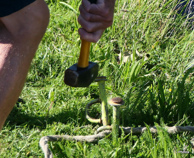 Okay so the bow ones had been removed. What about the stern two? Same as above, crow bar first but then he skipped the tiller extension bit and hit it with the hammer instead. That did the trick. I don't think these stakes had been driven into the ground quite like those on the bow. Ian has made a note to himself, Do not be quite so heavy handed with the lump hammer next time he goes to drive the stakes into the ground!